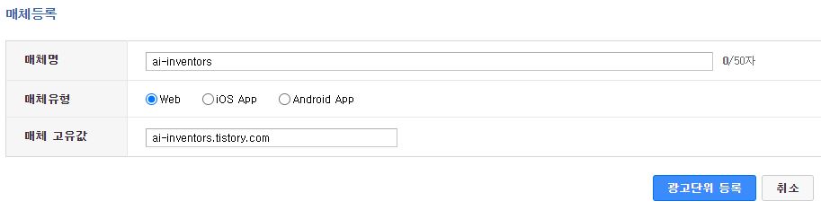 저는 매체명에는 "ai-inventors", 매체 고유값에는 "ai-inventors.tistory.com" 을 적었습니다.