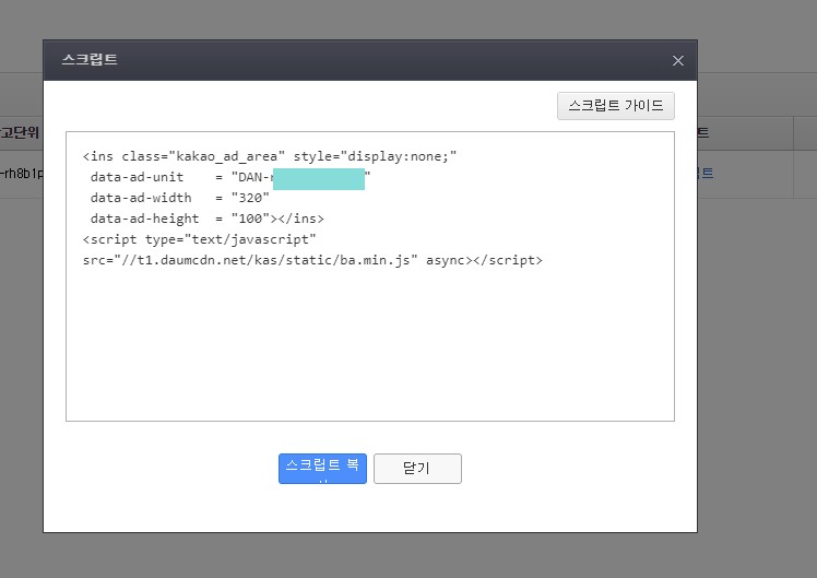 아래와 같이, 내 웹사이트에 등록할 광고의 소스코드를 확인하실 수 있습니다.
