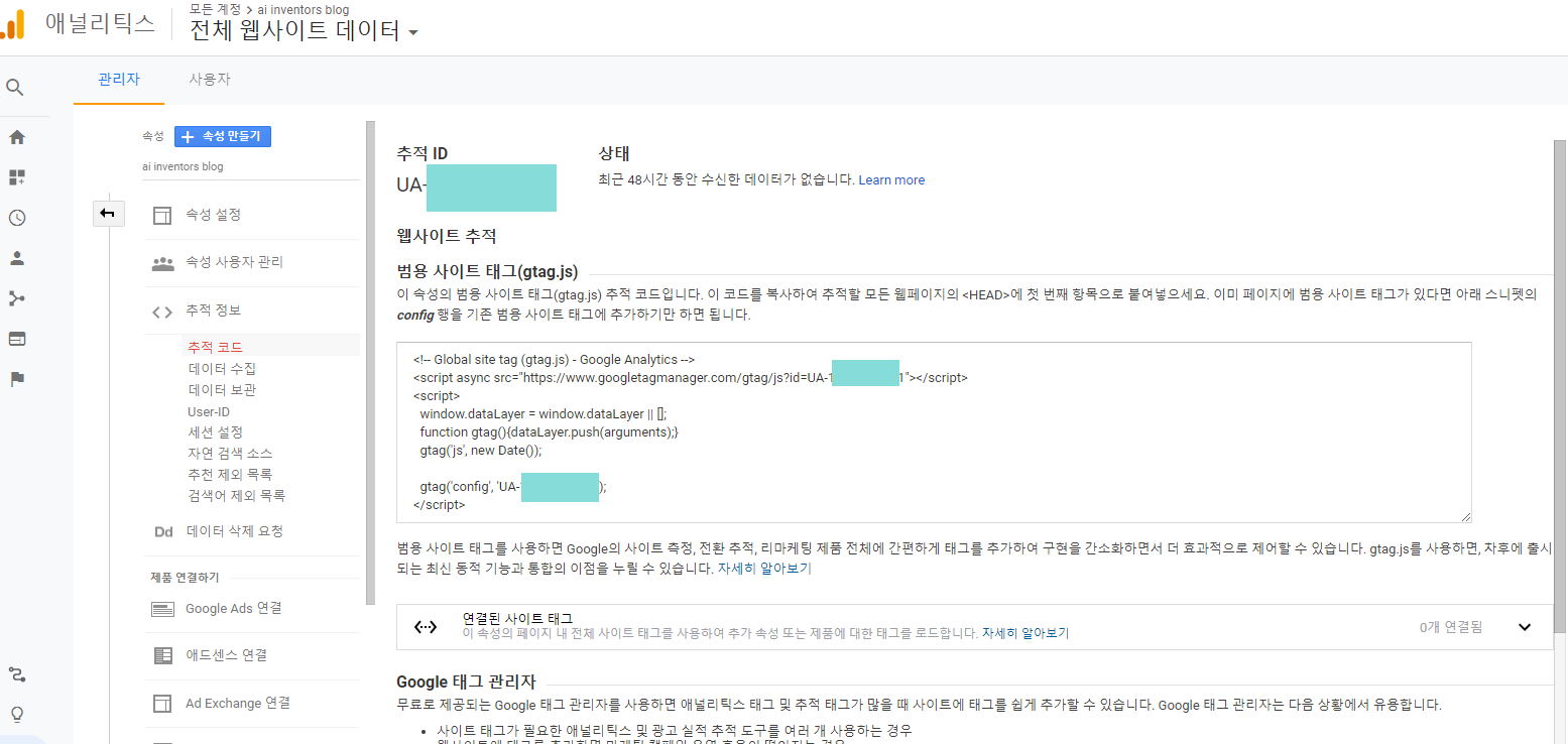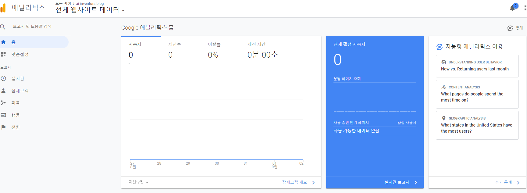내 웹사이트에 script 코드를 붙여넣었다면,구글 애널리틱스 대시보드로 이동하여, 최종적으로 잘 등록되었는지 확인하고, 마치면 되겠습니다.