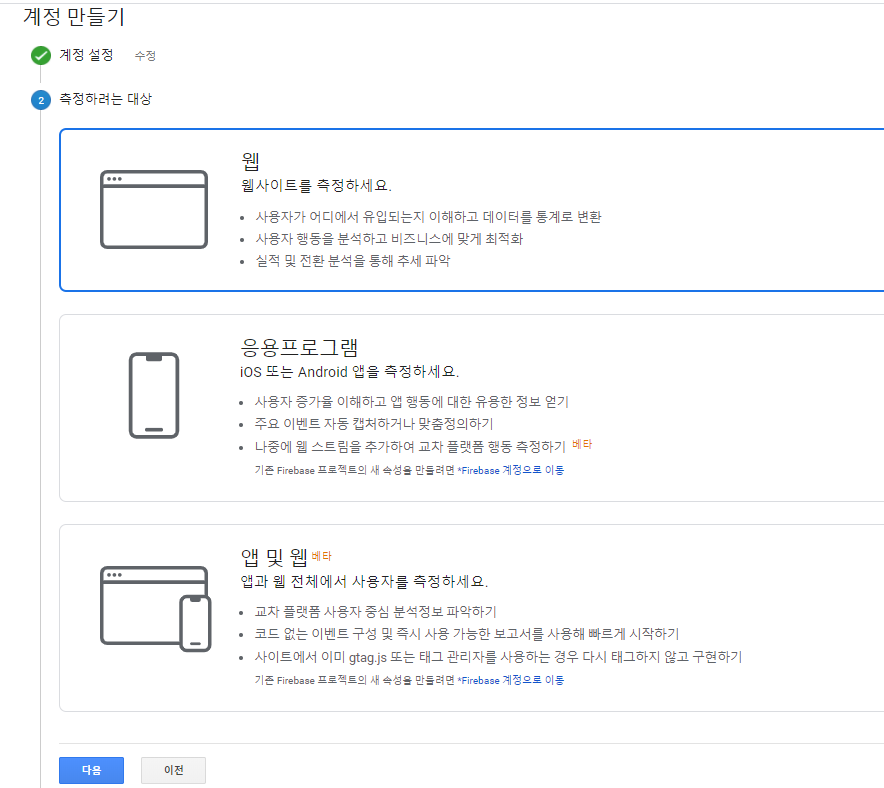 웹만 선택 후 다음 버튼 눌러보겠습니다.