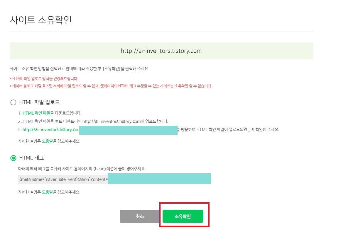 바로 밑 박스부분에 뜨는 메타태그를 복사해줍니다.